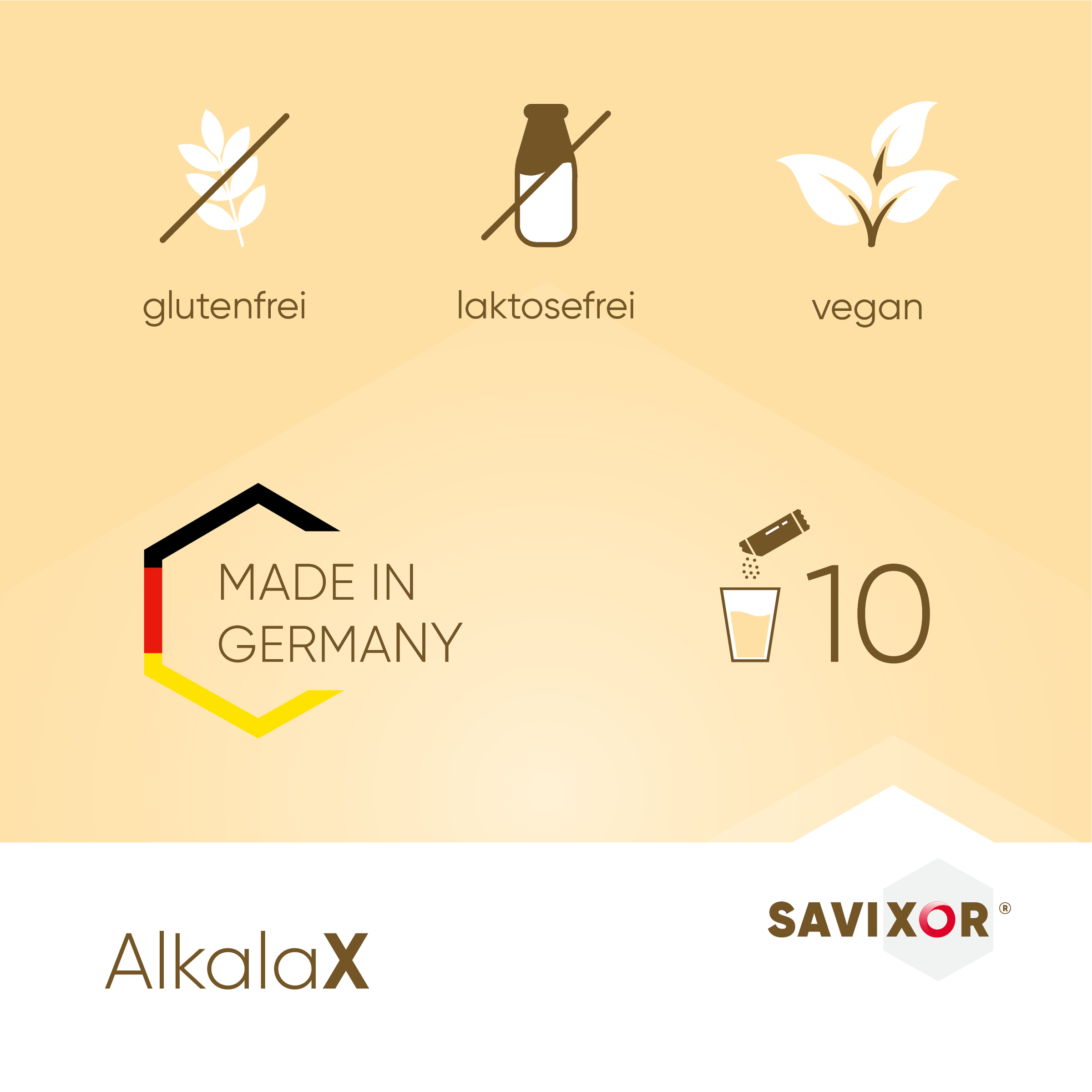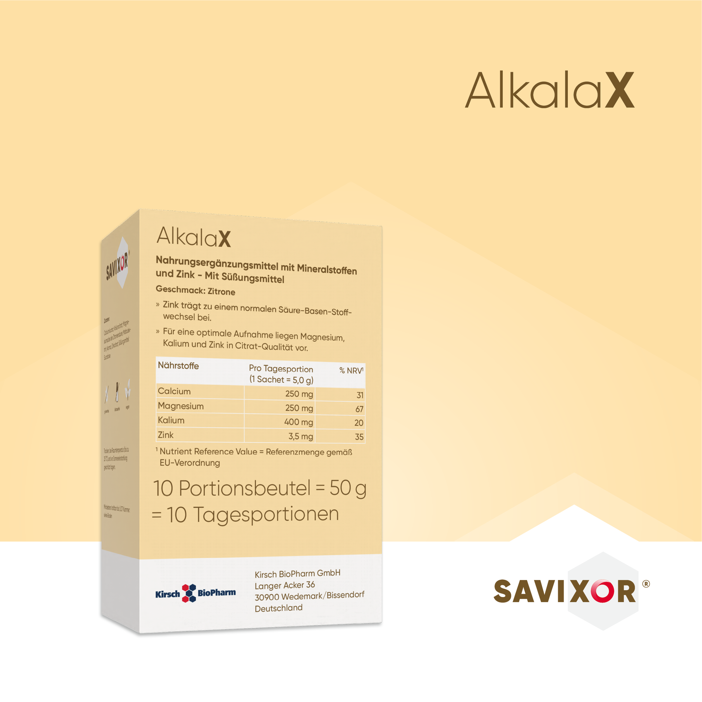 AlkalaX enthält die basischen Mineralstoffe Calcium, Magnesium und Kalium. Das zusätzlich enthaltene Spurenelement Zink trägt zu einem normalen Säure-Basen-Stoffwechsel bei. Calcium und Magnesium unterstützen einen normalen Energiestoffwechsel, wobei Magnesium zudem Müdigkeit und Ermüdung verringern kann.