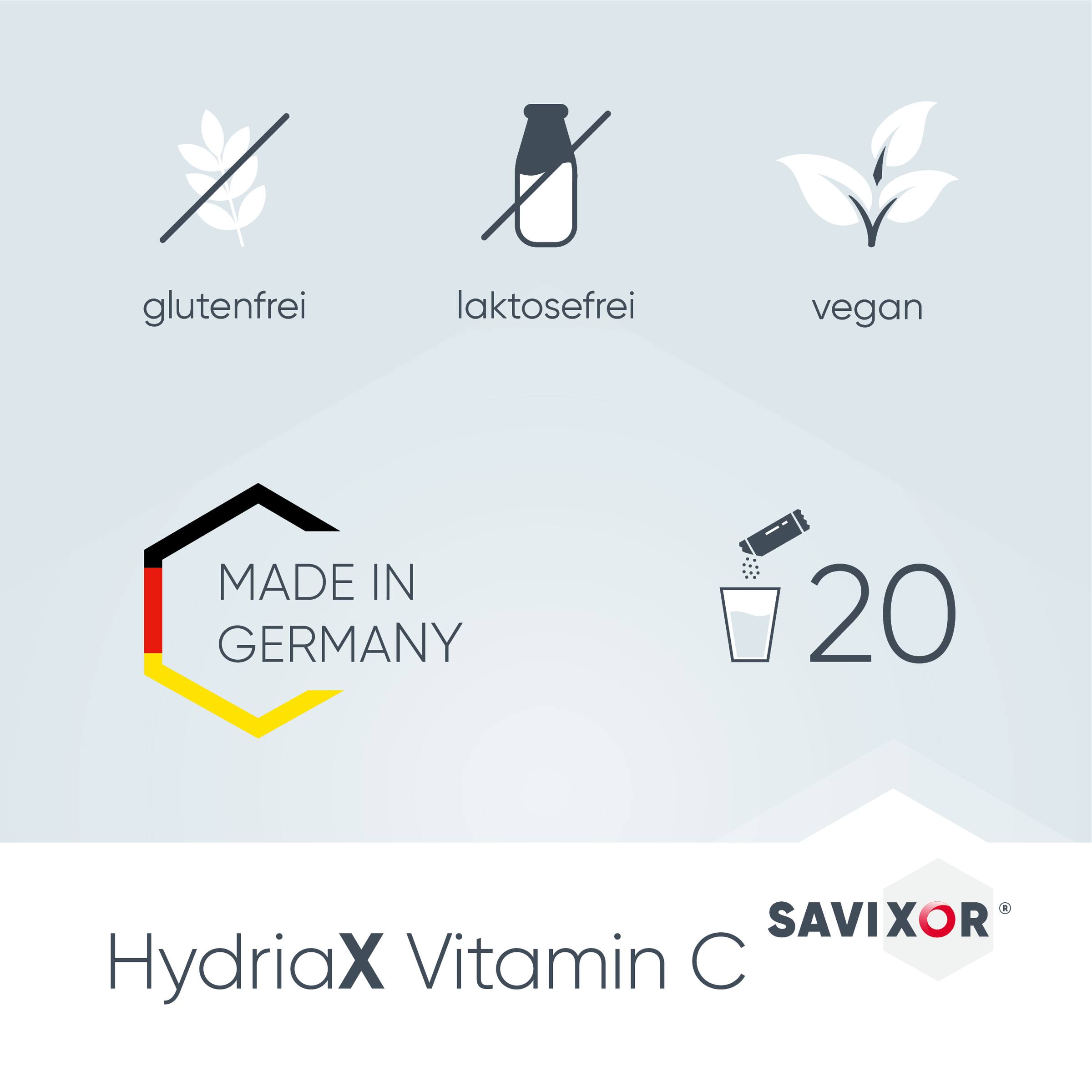 Das Produkt HydriaX Vitamin C enthält keine Allergene (gemäß Verordnung (EU) Nr. 1169/2011), keine GVO, ist gluten- sowie laktosefrei und für Vegetarier sowie Veganer geeignet.