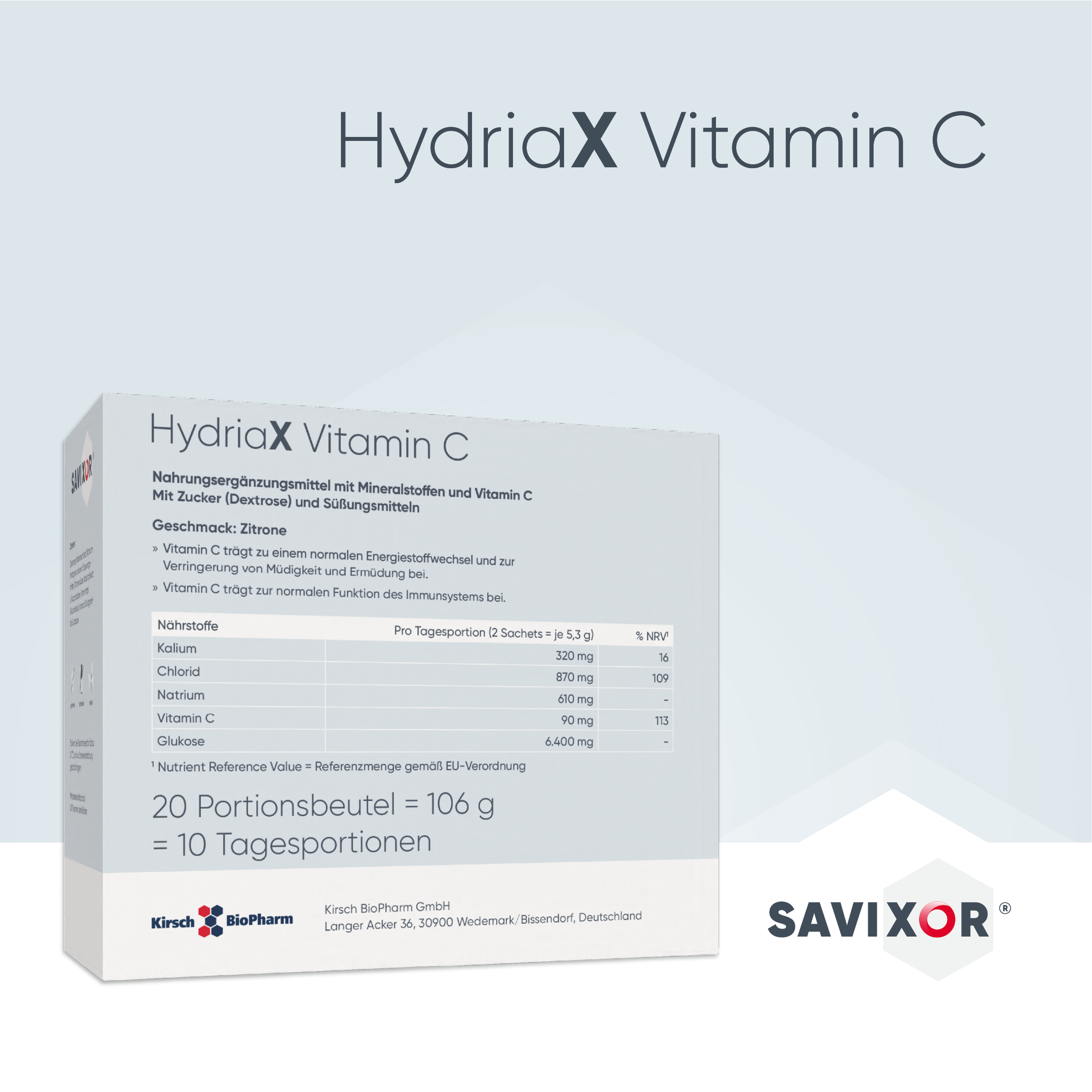 Unser Nahrungsergänzungsmittel HydriaX Vitamin C enthält die ideale Kombination aus Dextrose, Natriumchlorid, Natriumhydrogencarbonat und Kaliumchlorid.