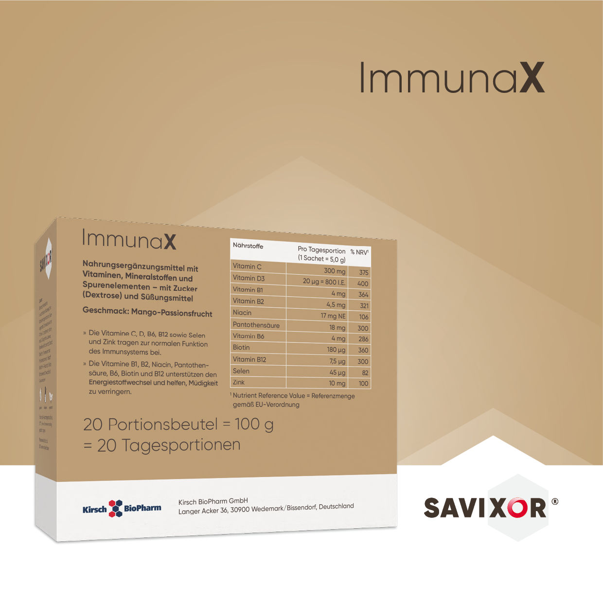 Um die Funktion des Immunsystems gezielt zu unterstützen, enthält ImmunaX eine ausgewogene Kombination aus wichtigen Vitaminen und Spurenelementen: Vitamin C, Vitamin D, B6, B12, Selen und Zink. Diese Nährstoffe tragen zur Aufrechterhaltung der normalen Immunfunktion bei.