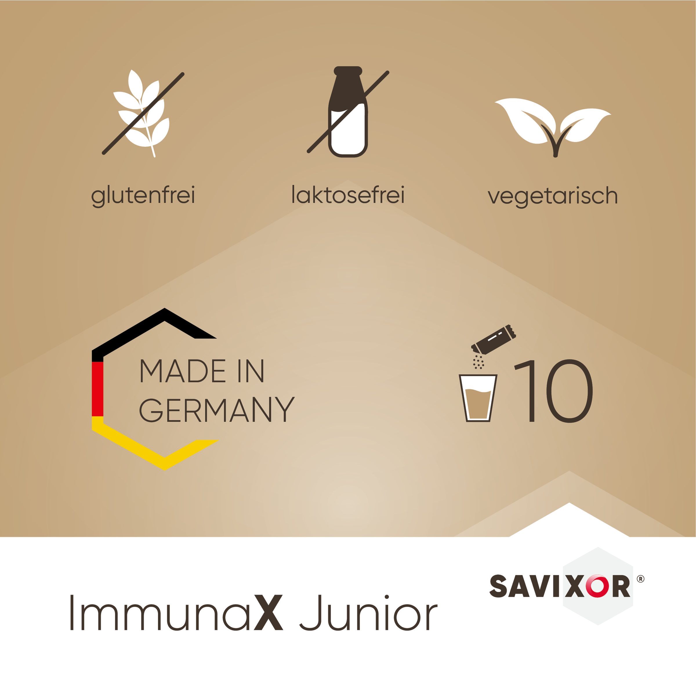 Das Produkt ImmunaX Junior enthält keine Allergene (gemäß Verordnung (EU) Nr. 1169/2011), keine GVO, ist gluten- sowie laktosefrei und für Vegetarier geeignet.